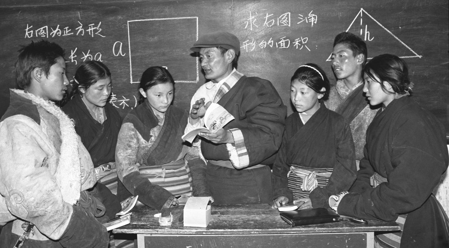 藏北高原班戈縣小學(xué)校長申卻堅村(藏族)給學(xué)生上課。(1988年1月30日發(fā))