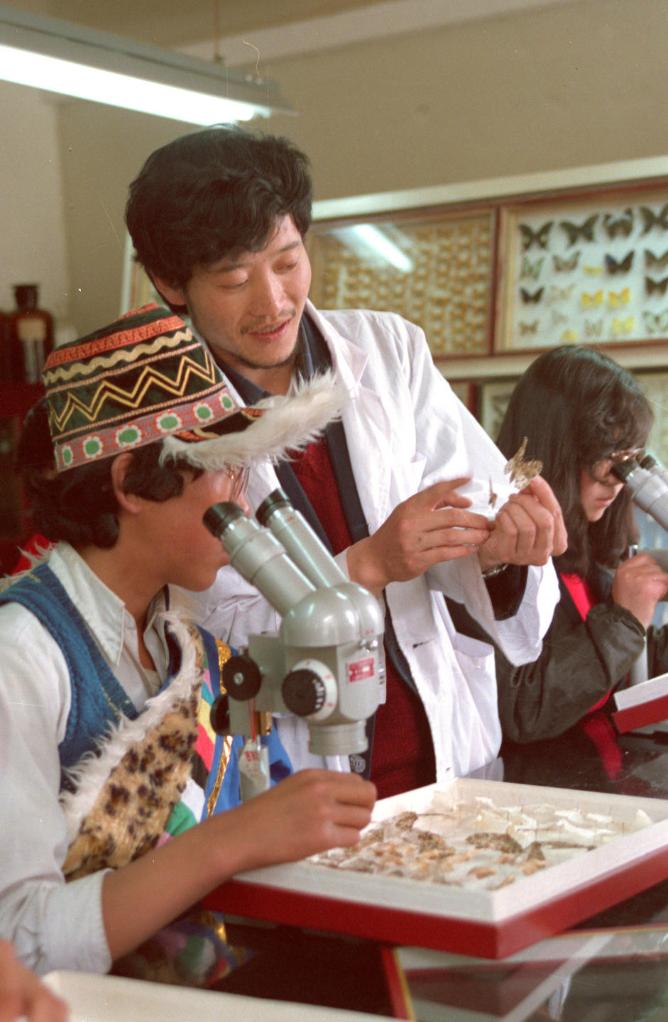 西藏農(nóng)牧學(xué)院農(nóng)學(xué)系老師在輔導(dǎo)藏族學(xué)生觀察蝴蝶昆蟲標(biāo)本。(1991年發(fā))