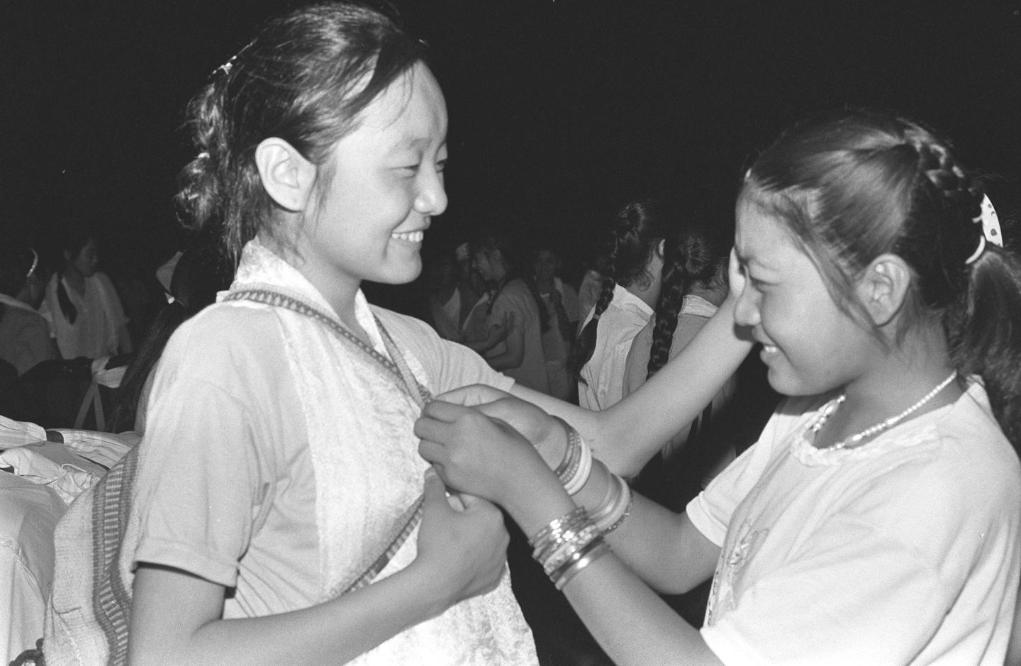 北京市西藏中學(xué)600多名高原兒女歡度藏歷水猴年新春佳節(jié)。預(yù)科二班的藏族中學(xué)生給他們的“張媽媽”——班主任張榮安老師穿上藏裝,共慶這歡樂時刻(1992年3月5日攝)。