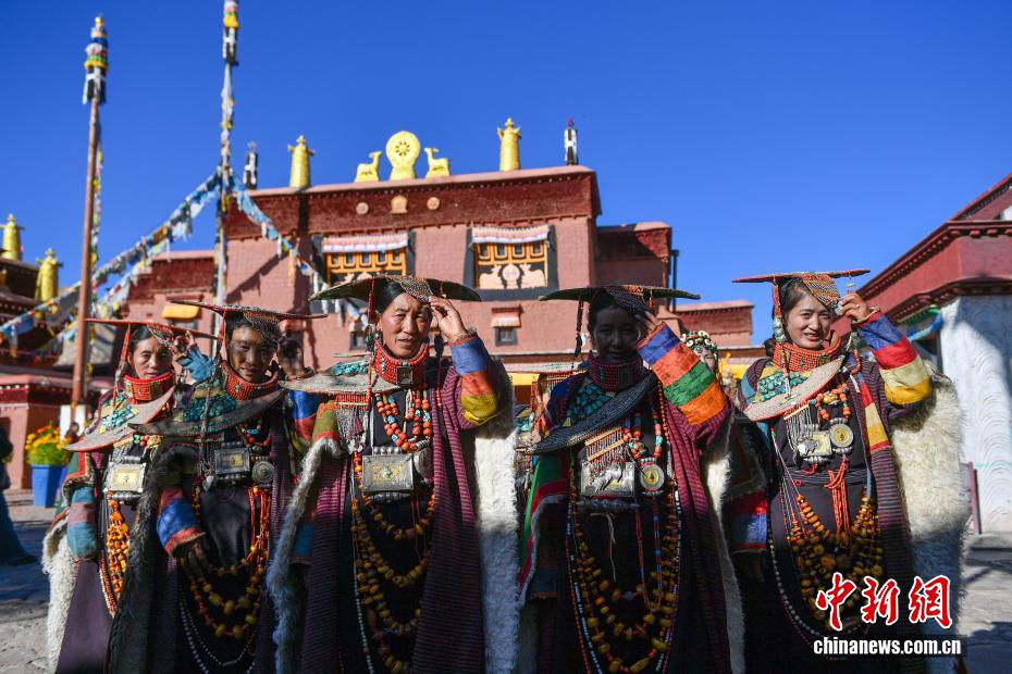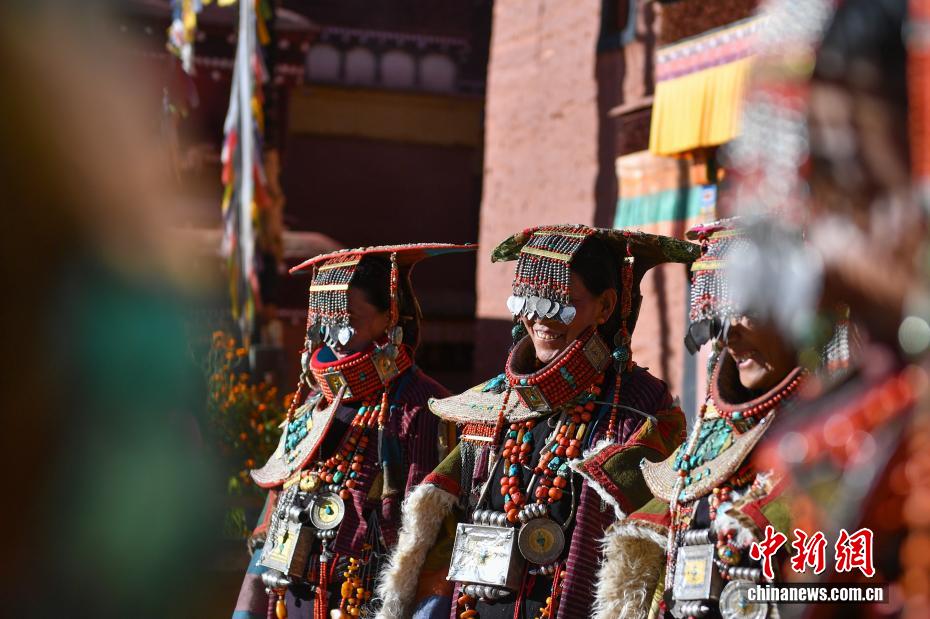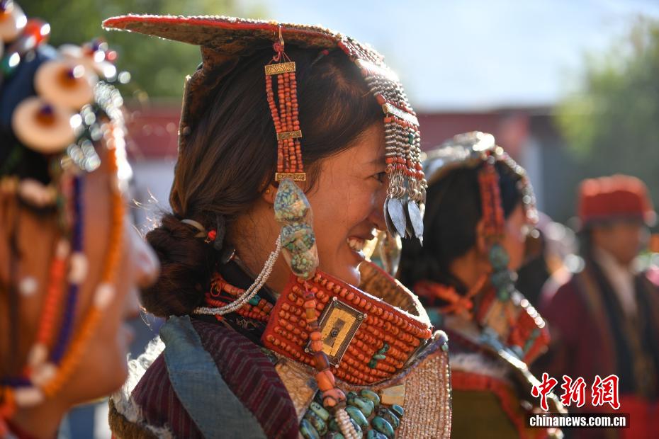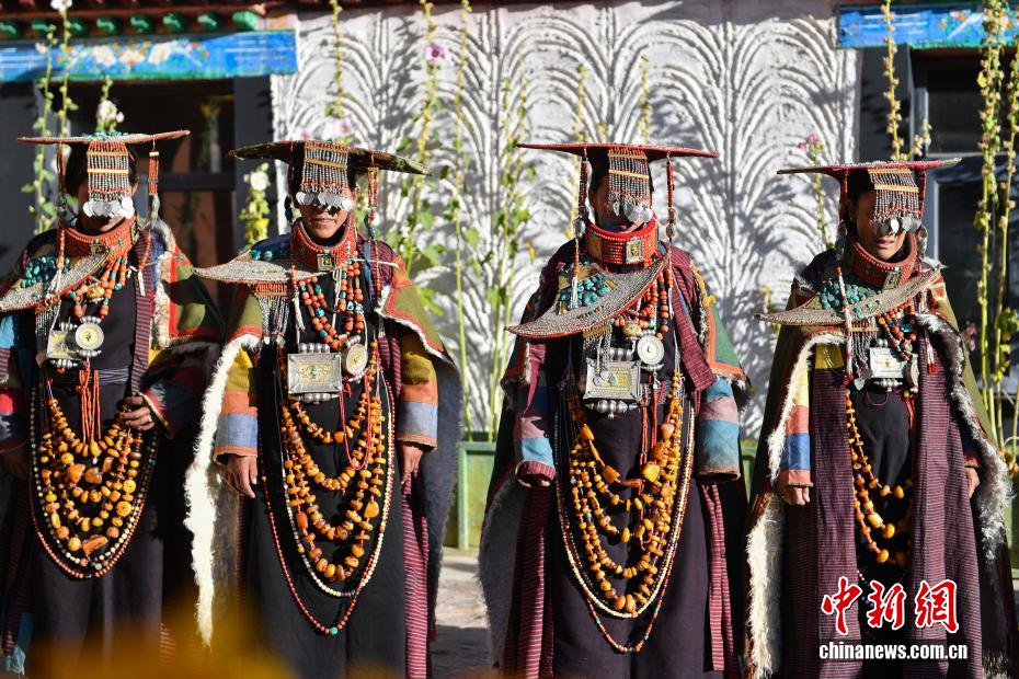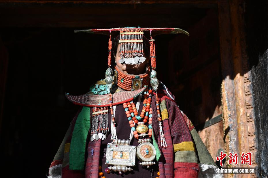 9月23日,西藏自治區(qū)阿里地區(qū)普蘭縣,至今保留著獨(dú)特的藏族服飾——普蘭服飾,它是中國國家級非物質(zhì)文化遺產(chǎn)。普蘭服飾已有1000多年的歷史,其中最精美、最獨(dú)特的是婦女的“孔雀服飾”,普蘭縣科迦村里有7戶人家保存著7套祖?zhèn)鞣?,一套重達(dá)20多公斤,裝飾有黃金、白銀、松石、瑪瑙、珊瑚、珍珠等,承載和沉淀了百年時(shí)光,堪稱“穿在身上的千年史”。時(shí)至今日,這種美麗的服飾文化還在當(dāng)?shù)貍鞒兄?。圖為西藏阿里地區(qū)普蘭縣科迦村,村民在展示普蘭服飾。貢確 攝