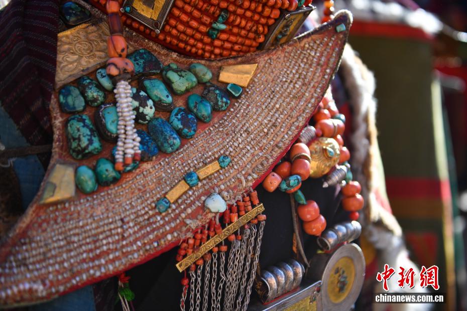 9月23日,西藏自治區(qū)阿里地區(qū)普蘭縣,至今保留著獨(dú)特的藏族服飾——普蘭服飾,它是中國國家級非物質(zhì)文化遺產(chǎn)。普蘭服飾已有1000多年的歷史,其中最精美、最獨(dú)特的是婦女的“孔雀服飾”,普蘭縣科迦村里有7戶人家保存著7套祖?zhèn)鞣?,一套重達(dá)20多公斤,裝飾有黃金、白銀、松石、瑪瑙、珊瑚、珍珠等,承載和沉淀了百年時(shí)光,堪稱“穿在身上的千年史”。時(shí)至今日,這種美麗的服飾文化還在當(dāng)?shù)貍鞒兄D為普蘭服飾細(xì)節(jié)展示。貢確 攝
