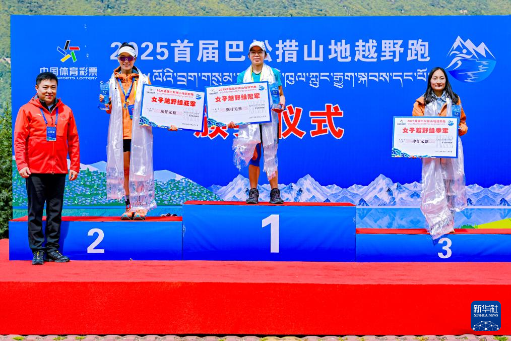 9月27日,30公里越野女子組冠軍周冬梅(右二)、亞軍歐陽瓊(左二)和季軍羅秀容(右一)在頒獎儀式上。新華社發(fā)