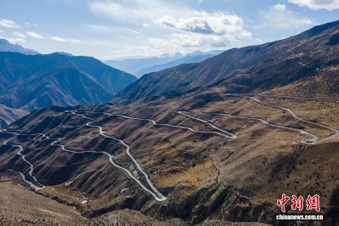 2023年1月16日,川藏公路西藏昌都段著名的“天路72拐”,該路段以高海拔、急彎、大落差等復雜驚險路況被人熟知。(無人機畫面)中新社記者 江飛波 攝