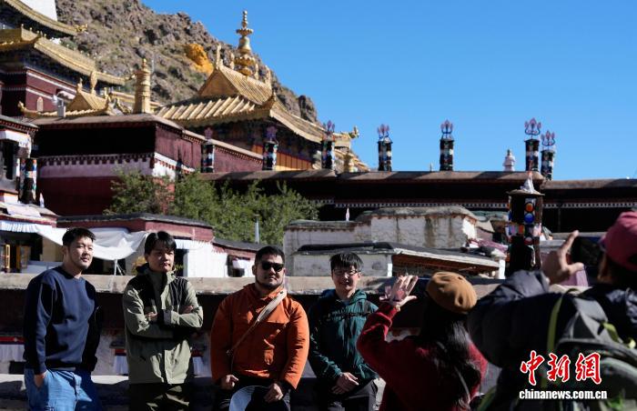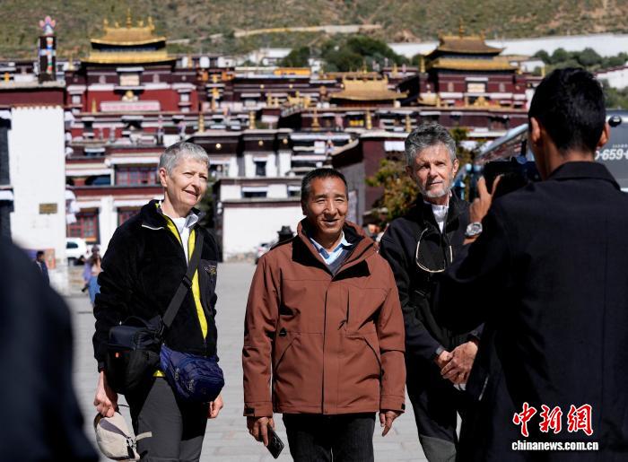 10月7日,外國游客在西藏日喀則市扎什倫布寺與導(dǎo)游合影留念。扎什倫布寺始建于公元1447年,是中國國家5A級旅游景區(qū)。憑借深厚的歷史底蘊和獨特的文化魅力,吸引眾多中外游客參觀游覽。中新社記者 李林 攝