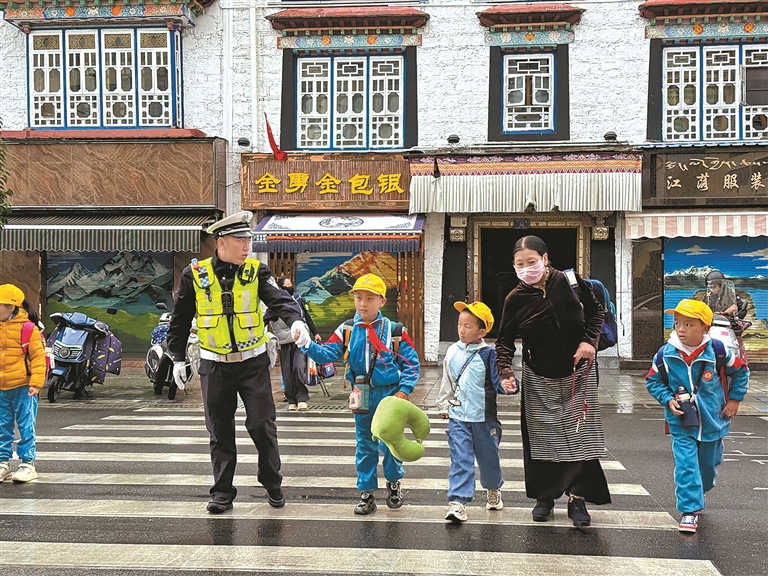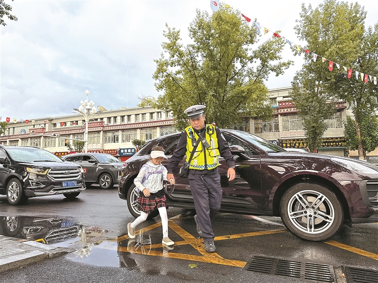 圖為拉薩市公安局交通管理支隊(duì)民警幫助獨(dú)行的學(xué)生穿過(guò)車(chē)流。記者 鹿麗娟 攝