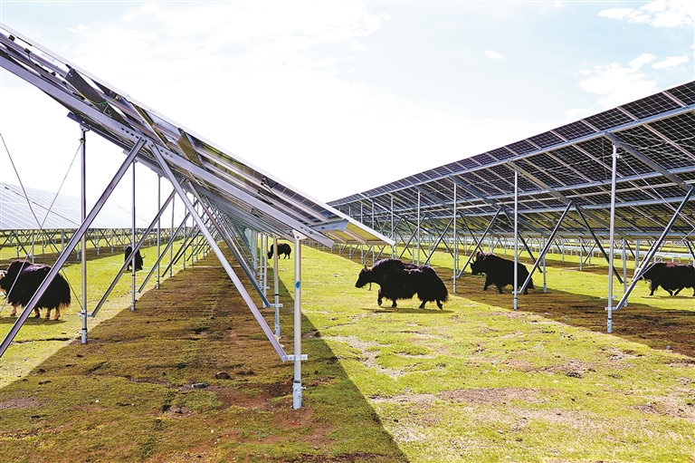 在華電羅布沙光伏項目區(qū),整齊的光伏板陣列與圣潔的雪山共同構(gòu)成獨特景致。光伏板下,回鋪的草甸悄然復(fù)蘇,牦牛悠然其間覓食,形成獨特的“牧光互補”模式,實現(xiàn)了生態(tài)保護與清潔能源生產(chǎn)的雙贏。