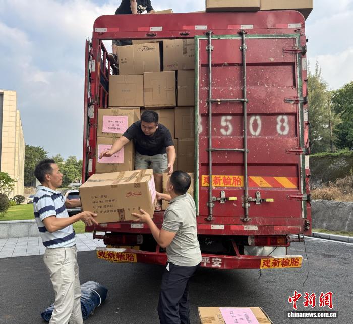 廣州市捐贈(zèng)站工作人員搬運(yùn)物資裝車(chē)。廣州市民政局 供圖