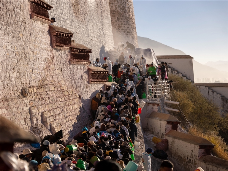 中午時分,溫暖的陽光灑在布達(dá)拉宮各個角落,一位穿著藏裝的阿姨一邊喘氣,一邊將手中的奶渣餅分發(fā)給旁邊的人。“今天真是個好日子,這么開心的日子和大家一起勞作,實在讓人難忘?!?/p>
