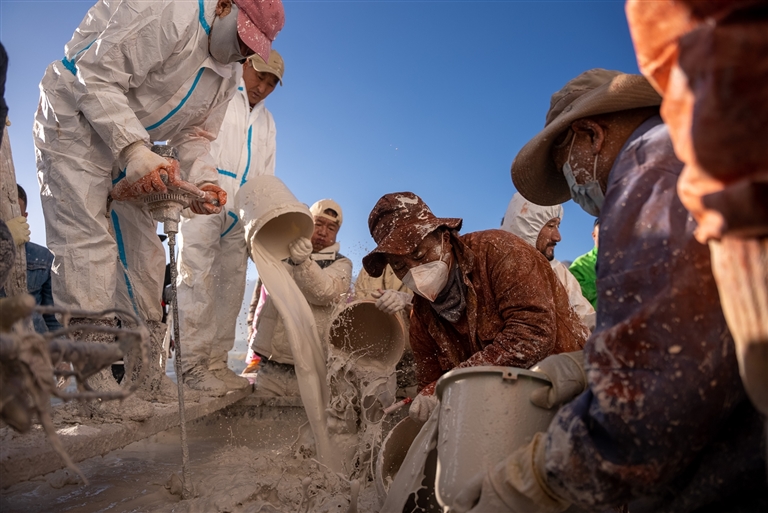 宮墻下,人們排隊領(lǐng)取防護(hù)服,而后疾步前往涂料攪拌點,生怕去遲了一步,這就是一年一度的布達(dá)拉宮粉刷季,現(xiàn)場鮮活又熱鬧。