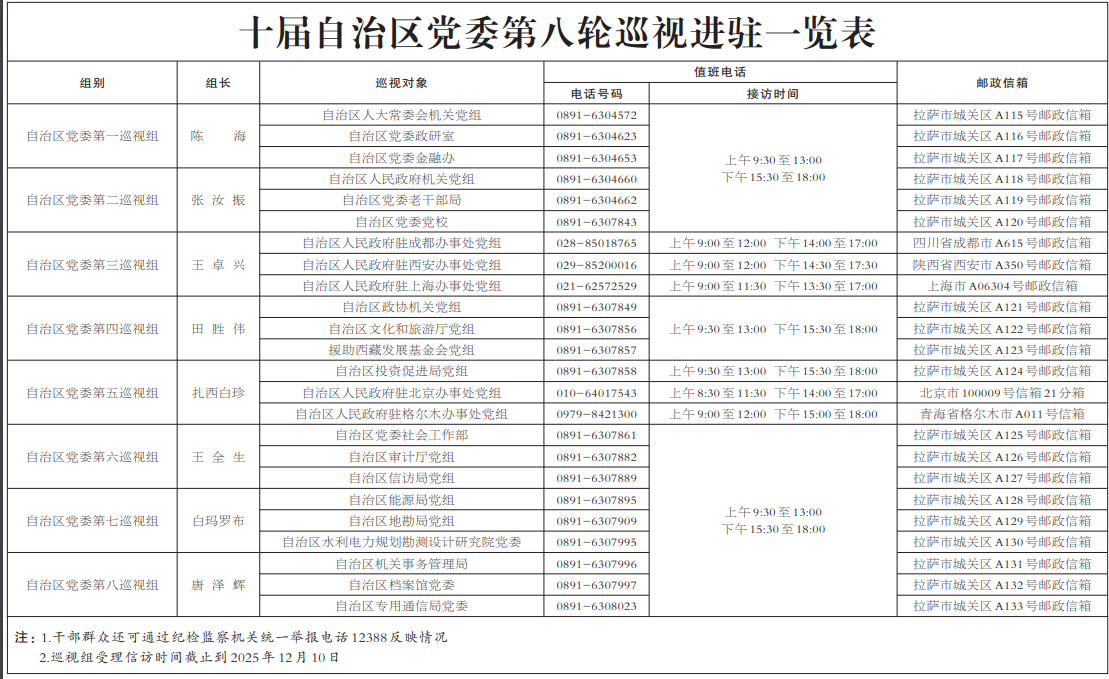 根據(jù)自治區(qū)黨委關(guān)于巡視工作的統(tǒng)一部署,截至10月24日,十屆自治區(qū)黨委第八輪巡視完成進(jìn)駐工作。自治區(qū)黨委巡視組將對(duì)自治區(qū)人大常委會(huì)機(jī)關(guān)、政府機(jī)關(guān)、政協(xié)機(jī)關(guān),自治區(qū)黨委社會(huì)工作部、政研室、金融辦、老干部局、機(jī)關(guān)事務(wù)管理局、黨校,自治區(qū)審計(jì)廳、信訪局、能源局、投資促進(jìn)局、地勘局、檔案館、專(zhuān)用通信局、水利電力規(guī)劃勘測(cè)設(shè)計(jì)研究院,自治區(qū)人民政府駐北京辦事處、駐成都辦事處、駐西安辦事處、駐上海辦事處、駐格爾木辦事處,援助西藏發(fā)展基金會(huì)等23個(gè)區(qū)直單位黨組織開(kāi)展常規(guī)巡視;對(duì)自治區(qū)文化和旅游廳黨組開(kāi)展巡視“回頭看”。
