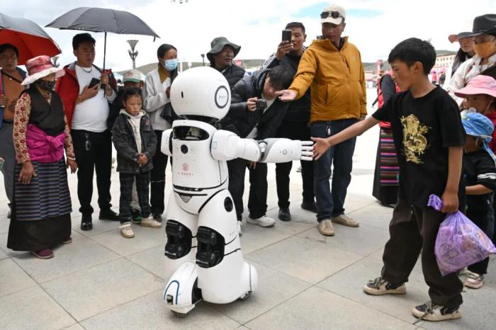 2025年9月6日,在西藏那曲市恰青賽馬節(jié)現(xiàn)場(chǎng),機(jī)器人的驚喜亮相,吸引前來觀賽的民眾與其互動(dòng)。中新社記者 貢嘎來松 攝