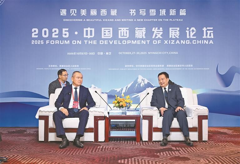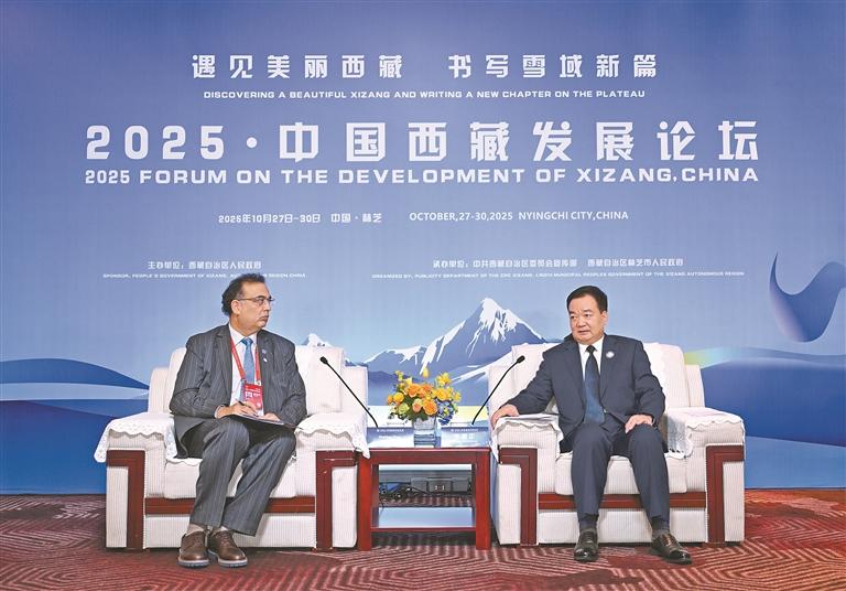 10月28日,自治區(qū)黨委書記王君正在林芝會見參加2025·中國西藏發(fā)展論壇的外國政要和駐華使節(jié)。這是王君正會見聯(lián)合國秘書長古特雷斯先生的代表,聯(lián)合國教科文組織駐華代表、東亞辦事處主任兼代表夏澤翰。本報記者 旦增西旦 攝