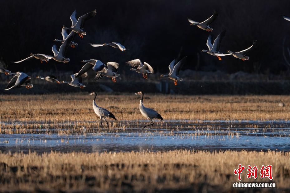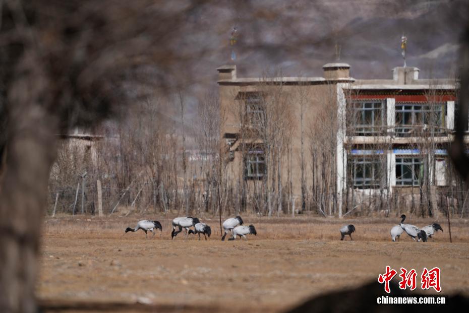 11月26日,位于西藏自治區(qū)拉薩市林周縣黑頸鶴自然保護區(qū)內(nèi),大批越冬黑頸鶴現(xiàn)身卡孜水庫及田間地頭,悠閑覓食、嬉戲。這些遠道而來的黑頸鶴,將在此棲息至次年三四月份。黑頸鶴為中國國家一級保護動物,也是唯一在高原生活、繁殖的鶴類。近年來,隨著當?shù)厣鷳B(tài)保護力度持續(xù)加大,前往林周縣越冬的黑頸鶴等候鳥數(shù)量逐年增多。圖為黑頸鶴在林周縣境內(nèi)的農(nóng)田里覓食、嬉戲。貢確 攝
