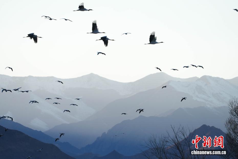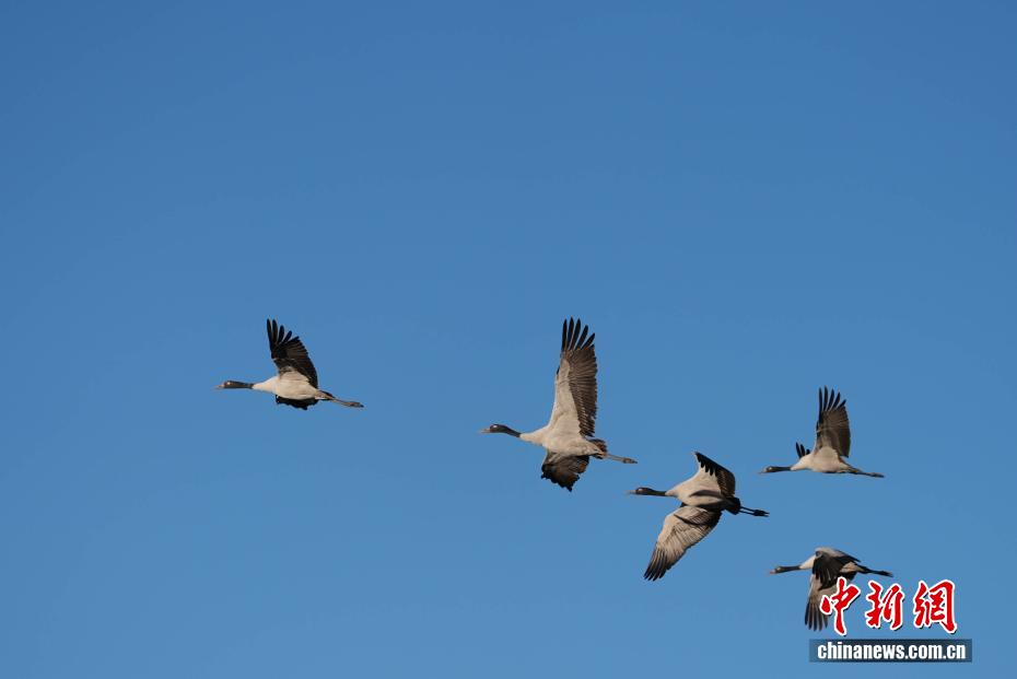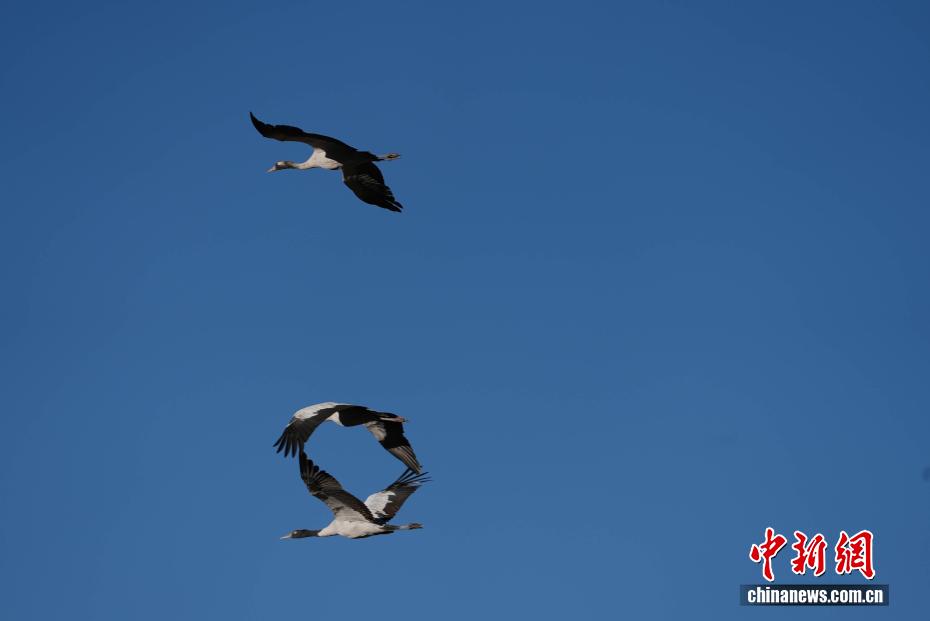 11月26日,位于西藏自治區(qū)拉薩市林周縣黑頸鶴自然保護區(qū)內(nèi),大批越冬黑頸鶴現(xiàn)身卡孜水庫及田間地頭,悠閑覓食、嬉戲。這些遠道而來的黑頸鶴,將在此棲息至次年三四月份。黑頸鶴為中國國家一級保護動物,也是唯一在高原生活、繁殖的鶴類。近年來,隨著當?shù)厣鷳B(tài)保護力度持續(xù)加大,前往林周縣越冬的黑頸鶴等候鳥數(shù)量逐年增多。圖為黑頸鶴在林周縣黑頸鶴保護區(qū)內(nèi)飛翔。貢確 攝