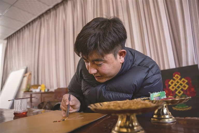 如今,仁青多吉依然在唐卡繪制與青稞文創(chuàng)之間忙碌著。陽光掠過他剛完成的一幅作品,黑頸鶴的棕褐色喙部、漸變棕灰的羽翼在光影下栩栩如生,一粒粒青稞如同被賦予了生命,靜靜訴說著林周的生態(tài)與農(nóng)耕故事。工作室里,畫師們偶爾會(huì)停下手中的筆,圍過來看他的創(chuàng)作進(jìn)度,時(shí)不時(shí)交流幾句,歡聲笑語間,傳統(tǒng)技藝的火種在默契中傳遞。