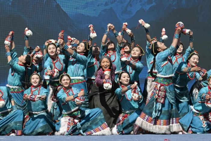 2025年11月2日,西藏自治區(qū)“大地歡歌 格?;ㄑ莩黾尽比珔^(qū)縣(區(qū))藝術(shù)團(tuán)惠民演出活動(dòng)在拉薩市堆龍德慶區(qū)民族團(tuán)結(jié)主題公園上演。圖為昌都市邊壩縣藝術(shù)團(tuán)表演女子群舞《糌粑揉出幸福情》。中新社記者 貢嘎來(lái)松 攝
