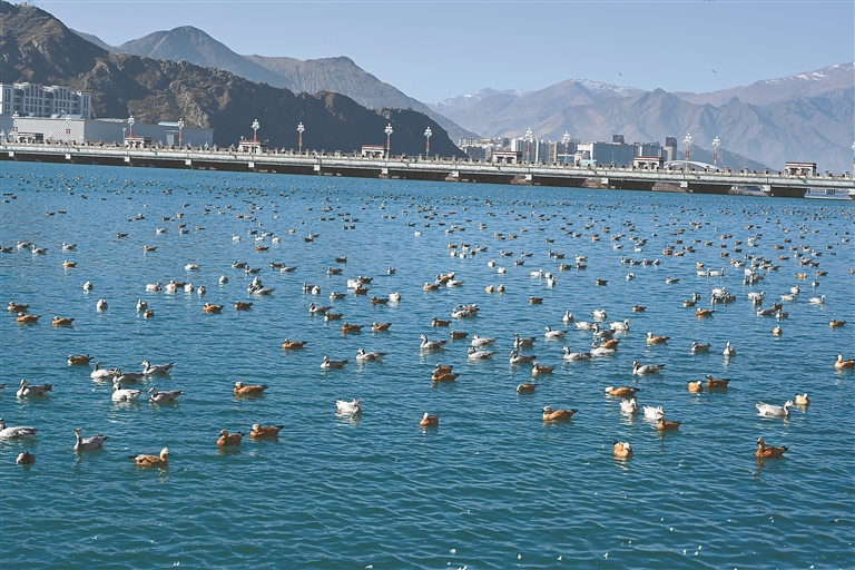 圖為成群的候鳥在拉薩河城區(qū)段人工湖棲息。記者 格桑倫珠 攝