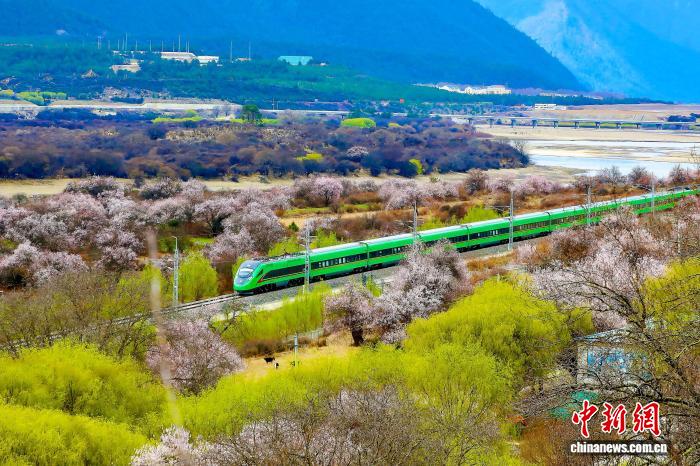 2025年西藏林芝桃花盛開時(shí)節(jié),高原復(fù)興號(hào)奔馳于拉林鐵路上。馬生明 攝