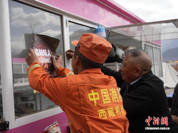 圖為給商鋪宣傳防火知識。丹增平措 攝