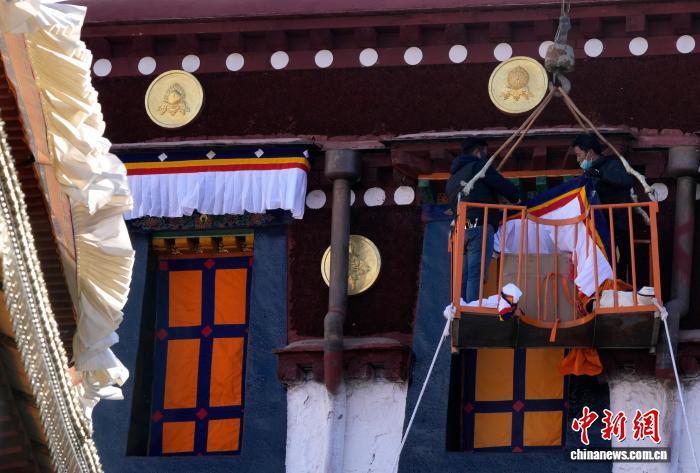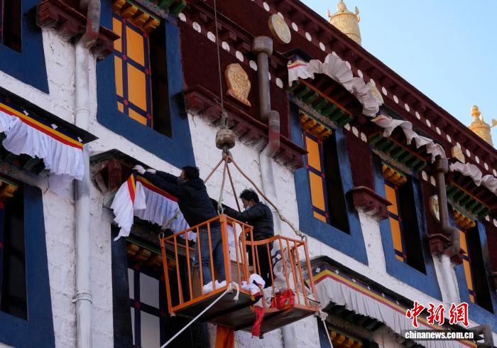 2月5日,西藏大昭寺更換“香布”,迎藏歷新年。“香布”是藏式建筑的裝飾,通常用五彩棉布縫制,主體為白色,搭配紅藍(lán)黃等色的邊沿,對(duì)窗沿等的顏料及木構(gòu)件起到保護(hù)作用。圖為工人們正乘坐吊車更換大昭寺“香布”。中新社記者 李林 攝