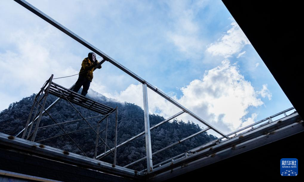 2月5日,玉麥鄉(xiāng)村民在焊接民居的天花板鋼架。新華社記者 丁增尼達(dá) 攝
