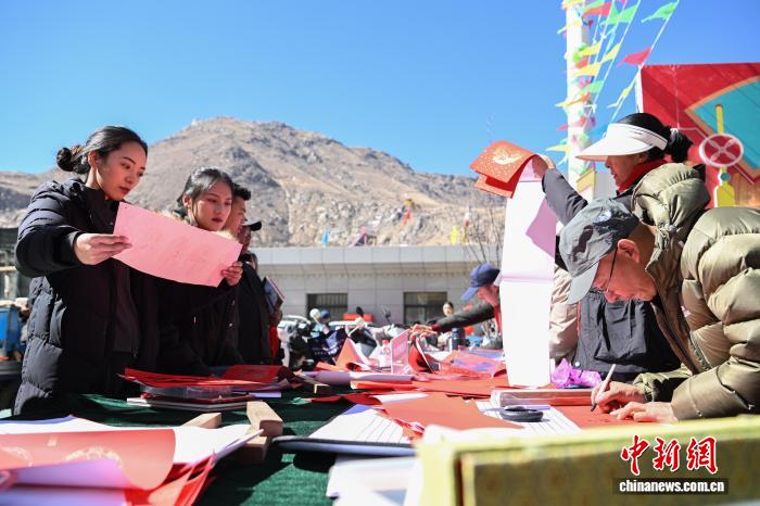 圖為書法家免費給村民寫對聯(lián)。中新社記者 貢嘎來松 攝