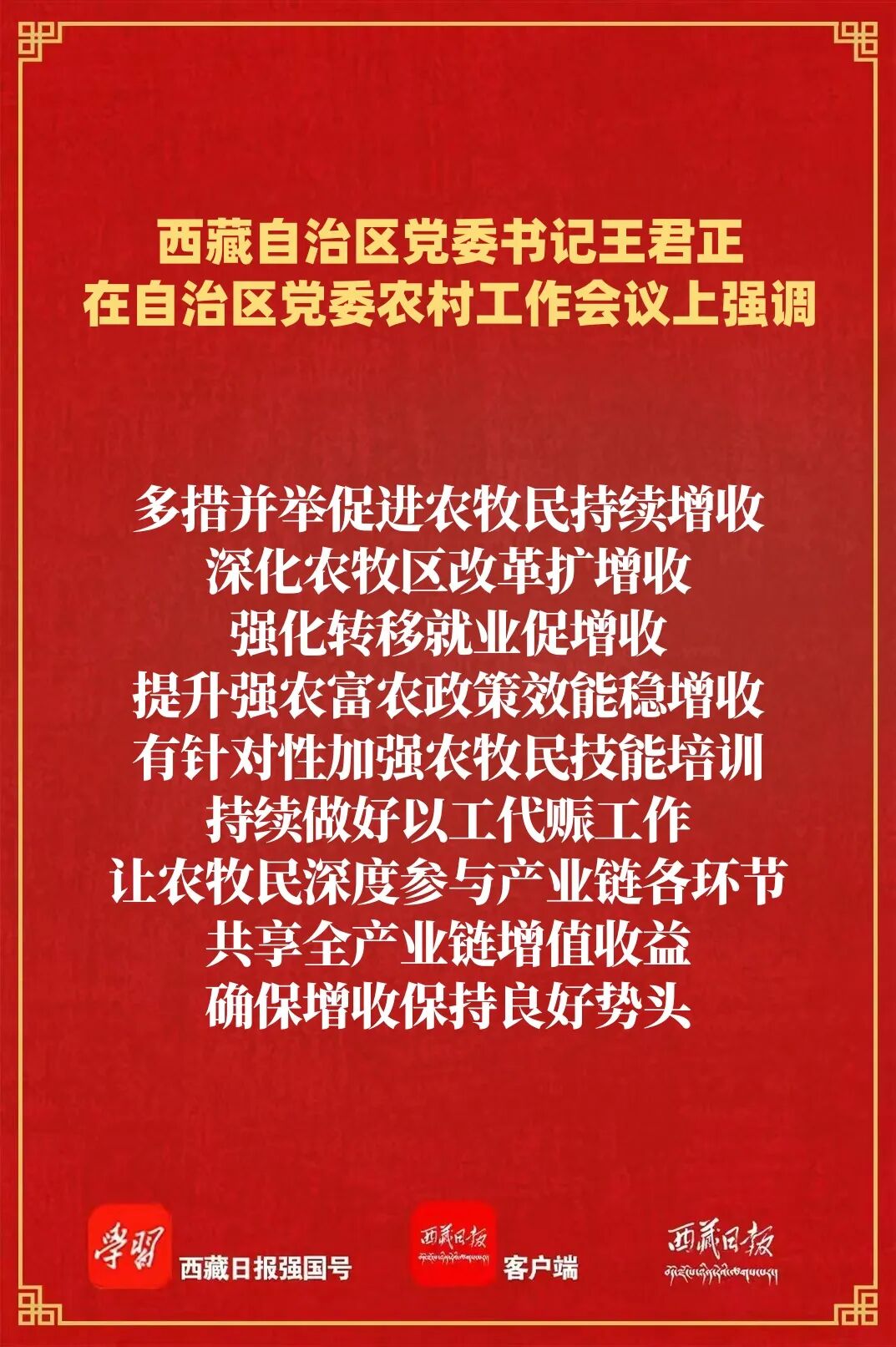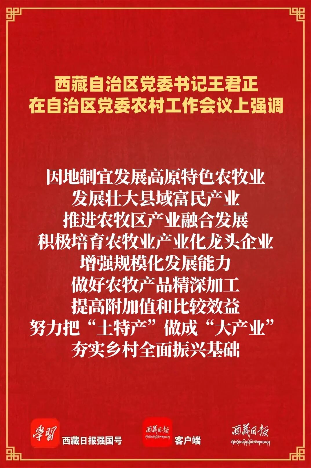 王君正強(qiáng)調(diào),要錨定目標(biāo)任務(wù),突出工作重點(diǎn),努力開創(chuàng)我區(qū)農(nóng)業(yè)農(nóng)村現(xiàn)代化、鄉(xiāng)村全面振興新局面。高度重視“三農(nóng)”工作,深刻認(rèn)識(shí)做好“三農(nóng)”工作是全面建設(shè)社會(huì)主義現(xiàn)代化新西藏、持續(xù)抓好“四件大事”落實(shí)、鞏固黨在西藏的執(zhí)政根基的必然要求,大力支持“三農(nóng)”工作,努力實(shí)現(xiàn)全區(qū)農(nóng)業(yè)基礎(chǔ)更加穩(wěn)固、農(nóng)村地區(qū)更加繁榮、農(nóng)民生活更加紅火。多措并舉促進(jìn)農(nóng)牧民持續(xù)增收,深化農(nóng)牧區(qū)改革擴(kuò)增收,強(qiáng)化轉(zhuǎn)移就業(yè)促增收,提升強(qiáng)農(nóng)富農(nóng)政策效能穩(wěn)增收,有針對(duì)性加強(qiáng)農(nóng)牧民技能培訓(xùn),持續(xù)做好以工代賑工作,讓農(nóng)牧民深度參與產(chǎn)業(yè)鏈各環(huán)節(jié),共享全產(chǎn)業(yè)鏈增值收益,確保增收保持良好勢(shì)頭。大力實(shí)施常態(tài)化精準(zhǔn)幫扶,及時(shí)精準(zhǔn)做好監(jiān)測(cè)識(shí)別,分類做好常態(tài)化幫扶,筑牢兜底保障防線,堅(jiān)持把產(chǎn)業(yè)幫扶作為根本措施,優(yōu)化產(chǎn)業(yè)幫扶方式,不斷提升幫扶實(shí)效,確保不發(fā)生規(guī)模性返貧致貧。著力提升糧食和重要農(nóng)產(chǎn)品產(chǎn)能,毫不放松抓好糧食特別是青稞生產(chǎn),加強(qiáng)耕地保護(hù)和高標(biāo)準(zhǔn)農(nóng)田建設(shè),加強(qiáng)畜牧業(yè)和“菜籃子”產(chǎn)品生產(chǎn)供給,強(qiáng)化農(nóng)牧業(yè)科技賦能,加大氣象監(jiān)測(cè)預(yù)報(bào)預(yù)警力度,增強(qiáng)農(nóng)牧業(yè)防災(zāi)減災(zāi)能力。因地制宜發(fā)展高原特色農(nóng)牧業(yè),發(fā)展壯大縣域富民產(chǎn)業(yè),推進(jìn)農(nóng)牧區(qū)產(chǎn)業(yè)融合發(fā)展,積極培育農(nóng)牧業(yè)產(chǎn)業(yè)化龍頭企業(yè),增強(qiáng)規(guī)?;l(fā)展能力,做好農(nóng)牧產(chǎn)品精深加工,提高附加值和比較效益,努力把“土特產(chǎn)”做成“大產(chǎn)業(yè)”,夯實(shí)鄉(xiāng)村全面振興基礎(chǔ)。加快推進(jìn)高原和美鄉(xiāng)村建設(shè),深入學(xué)習(xí)運(yùn)用“千萬工程”經(jīng)驗(yàn),加快農(nóng)牧區(qū)基礎(chǔ)設(shè)施建設(shè),提高教育、醫(yī)療、社保等公共服務(wù)水平,持續(xù)整治提升農(nóng)牧區(qū)人居環(huán)境,把農(nóng)牧區(qū)建設(shè)得更加宜居宜業(yè)。提高鄉(xiāng)村治理水平,持續(xù)加強(qiáng)黨建引領(lǐng),充分發(fā)揮基層黨組織戰(zhàn)斗堡壘作用,深化文明鄉(xiāng)風(fēng)建設(shè),推動(dòng)形成向上向善的鄉(xiāng)村道德風(fēng)尚;堅(jiān)持和發(fā)展新時(shí)代“楓橋經(jīng)驗(yàn)”,不斷提升基層治理體系和治理能力現(xiàn)代化水平,確保農(nóng)牧區(qū)持續(xù)和諧穩(wěn)定。