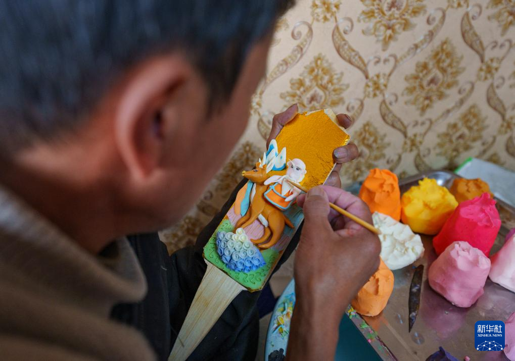 2月12日,在拉薩市林廓東路,來自西藏日喀則市仁布縣普松鄉(xiāng)的手工藝人羅布在制作酥油花。新華社記者 丁增尼達 攝