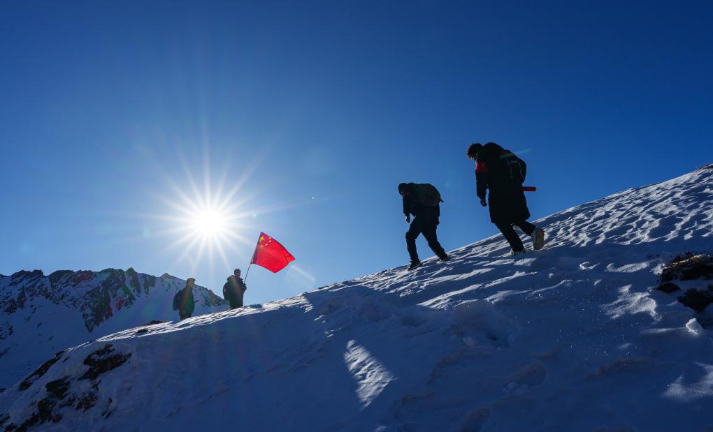 在西藏山南市隆子縣玉麥鄉(xiāng)境內(nèi),護(hù)邊員們?cè)谘┢律涎策墸?月6日攝)。新華社記者 丁增尼達(dá) 攝