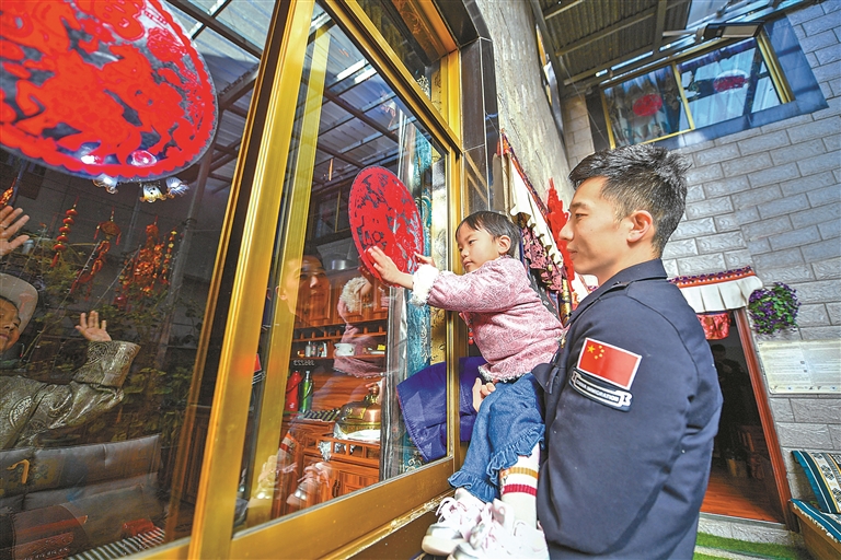 民警抱著普布倉決的小孫女貼窗花。旦增嘎瓦 攝