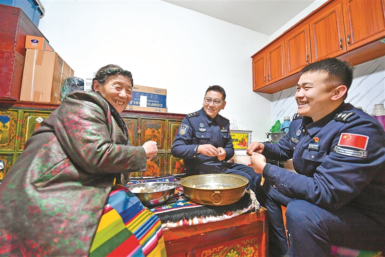 “本來想著今年回不了家,心里空落落的,沒想到在石曲哥家過上了這么熱鬧的‘古突’夜,也算是吃上了年夜飯?!比ツ陝倕⒓庸ぷ鞯哪贻p民警徐若吃到一塊象征“吉祥”的面疙瘩,眼眶微熱。次仁卓瑪又為他添上一勺湯:“我們是一家人,這里就是家?!?/p>
