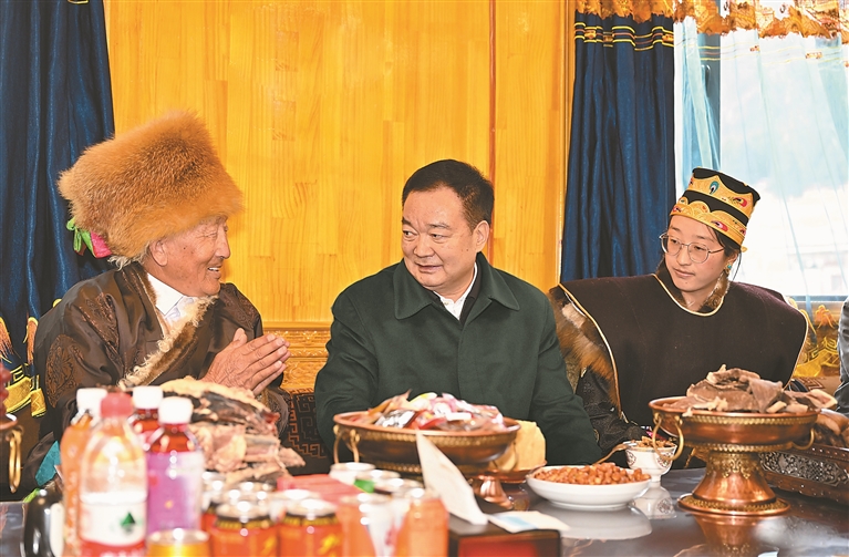 中華民族傳統(tǒng)節(jié)日春節(jié)剛過,雪域高原又迎來了藏歷新年初二,家家戶戶回蕩著“羅薩扎西德勒”的溫馨祝福?!斑^年了,祝你們新年快樂、身體健康、吉祥如意!”王君正走進(jìn)魯朗鎮(zhèn)扎西崗村77歲的老黨員、致富帶頭人平措家里,嶄新的香布、整潔的小院,切瑪斑斕、卡塞飄香,家里充滿濃濃的年味兒?!吧眢w怎么樣?”“民宿生意好不好?”在暖意融融的客廳里,王君正和老人聊家常,詢問身體狀況及家庭收入等情況,隨后走進(jìn)平措家的民宿旅館,從價(jià)格、住宿條件到屋外山景,看得仔細(xì)、問得深入。了解到在以習(xí)近平同志為核心的黨中央親切關(guān)懷下,扎西崗村發(fā)生了翻天覆地的變化,平措一家借助本地旅游資源,開民宿、做餐飲,年收入不斷增加,日子越過越好,王君正為他們的發(fā)展感到由衷高興、為他們的幸福生活點(diǎn)贊。他說,“看著北斗星走不迷路、跟著共產(chǎn)黨走會幸?!保@些好日子,離不開以習(xí)近平同志為核心的黨中央對西藏工作的高度重視、對西藏各族人民的深切關(guān)懷,大家要感恩總書記、感謝黨中央,更加堅(jiān)定不移聽黨話、感黨恩、跟黨走;黨員要發(fā)揮先鋒模范作用,發(fā)揚(yáng)黨的光榮傳統(tǒng)和優(yōu)良作風(fēng),帶領(lǐng)村民用勤勞的雙手把家園建設(shè)得更加美好,把日子過得更加甜蜜。