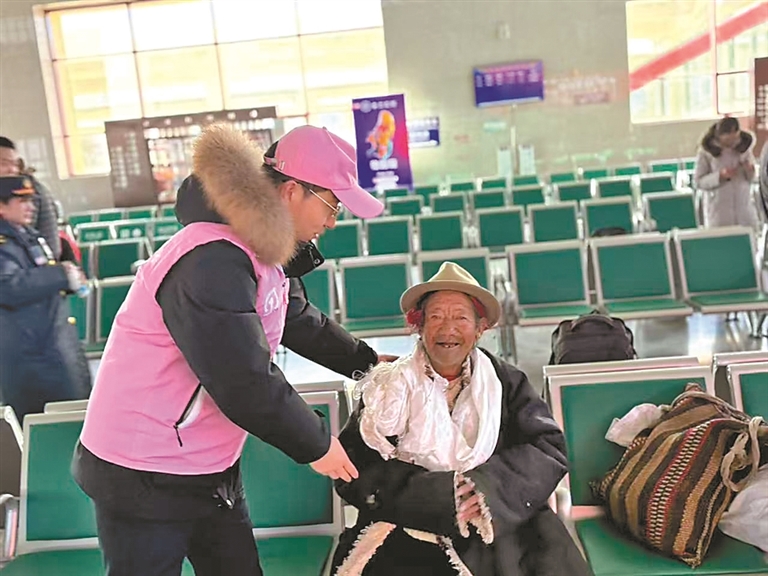 圖為在中國鐵路青藏集團(tuán)有限公司拉薩車務(wù)段日喀則站內(nèi),“小花朵青年志愿服務(wù)隊(duì)”志愿者在為旅客提供服務(wù)。記者 鹿麗娟 攝