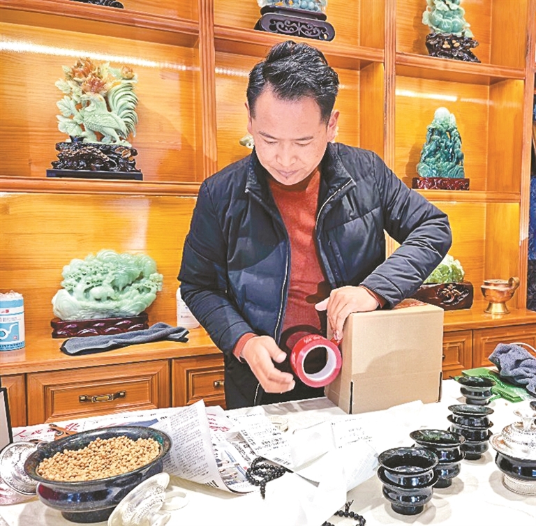 圖為銷售負(fù)責(zé)人曲朗在對玉石碗打包裝箱。記者 扎西頓珠 攝