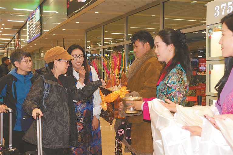 當(dāng)首批香港游客走出機(jī)場(chǎng)時(shí),悠揚(yáng)的歌聲響起,藝術(shù)團(tuán)成員迎上前,向每一位遠(yuǎn)道而來(lái)的客人敬獻(xiàn)哈達(dá)。