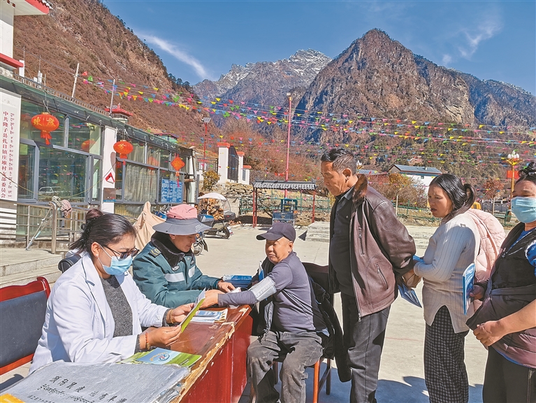 圖為醫(yī)護人員為莊堆村廣大群眾進行義診體檢與健康宣傳。記者 武沛濤 攝