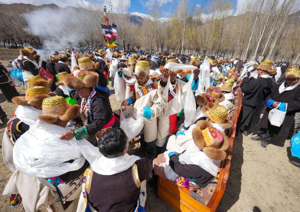 62歲的村民桑吉頭頂黑色禮帽,身著氆氌藏裝,跟鄉(xiāng)親們聊著天。他說,盡管外出務(wù)工的收入比務(wù)農(nóng)高,但春耕儀式當(dāng)天,年輕人都會趕回村里參加,祈愿風(fēng)調(diào)雨順、五谷豐登。