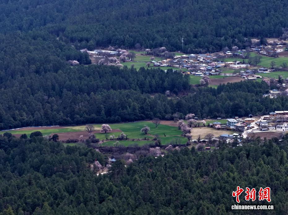 3月26日,西藏波密桃花林海相映成趣。崗云杉林位于西藏林芝市波密縣,森林覆蓋率達(dá)61%以上,海拔2700米左右。俯瞰崗云杉林,周邊桃花綻放,與密林、農(nóng)田構(gòu)成美麗自然畫卷。(無(wú)人機(jī)照片)中新社記者 李林 攝