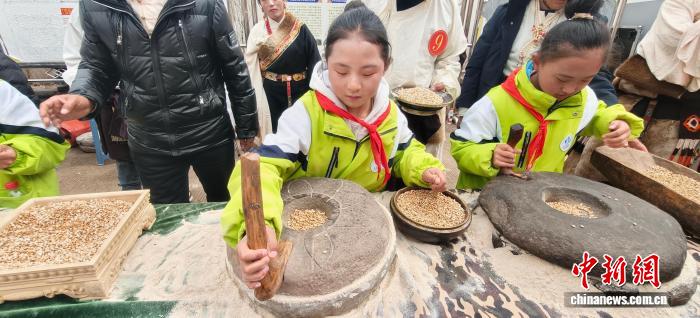 圖為俄洛鎮(zhèn)賽事活動(dòng)中組織學(xué)生體驗(yàn)傳統(tǒng)磨糌粑技能。卡若區(qū)融媒體中心 供圖