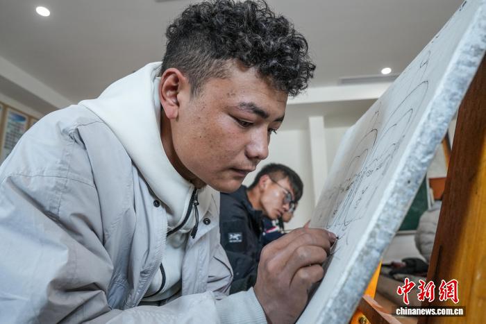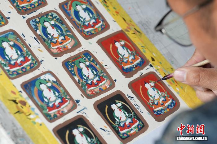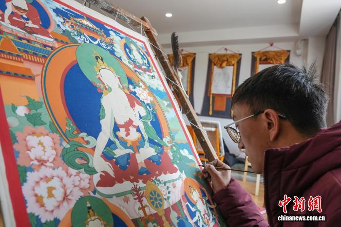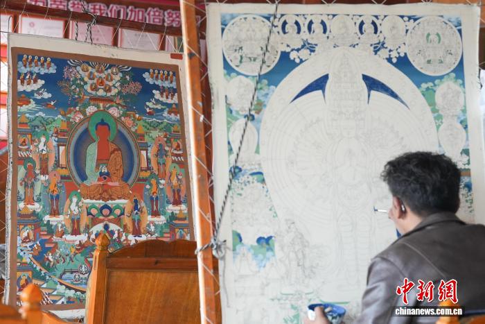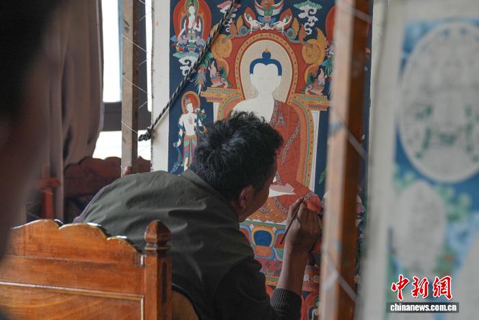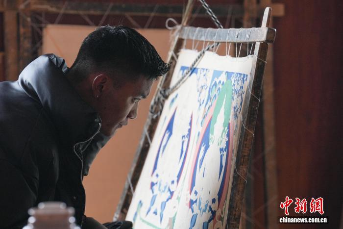 近日,記者在西藏日喀則市走訪了解到,當?shù)匾幻褡迨止I(yè)機構(gòu)依托西藏日喀則唐卡協(xié)會、日喀則唐卡畫院及本地職業(yè)培訓(xùn)學校,開展唐卡等傳統(tǒng)技藝培訓(xùn)。該機構(gòu)2012年成立,內(nèi)設(shè)唐卡、木雕等5個技藝部門。累計培訓(xùn)780余名傳承人,就業(yè)率78%;帶動26人就業(yè),含6名脫貧民眾、1名大學生,月均工資5000元人民幣,實現(xiàn)文化傳承與民眾增收。圖為畫師在繪制唐卡。貢確 攝