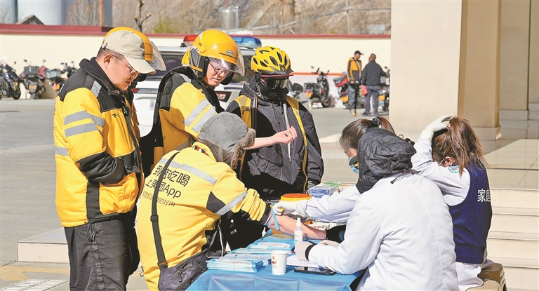 活動通過交通安全知識宣講、發(fā)放慰問品等形式,提升新就業(yè)群體安全意識;圍繞勞動維權(quán)、用工保障等內(nèi)容答疑解惑,指導(dǎo)依法維權(quán)。同時,提供健康檢測服務(wù),邀請騎手代表參與驛站規(guī)劃建設(shè)。