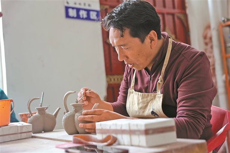 公司實行“按勞計酬”的薪酬制度,為員工提供了穩(wěn)定的收入保障。這份“家門口”的可觀收入,讓員工們穩(wěn)穩(wěn)撐起了家庭的幸福生活。“以前在家種地,收入不穩(wěn)定,現(xiàn)在在公司做黑陶,不僅學到了一門手藝,每個月還有固定工資,日子越過越有盼頭了!”作為曲珠的第一批學生,扎西如今已能獨立設計制作復雜的黑陶茶具,月薪穩(wěn)定在5000元左右,他的感慨道出了所有員工的心聲。這些扎根鄉(xiāng)土的手藝人,不僅用雙手改變了生活,更因?qū)@門技藝的熱愛與堅守,成為察雅黑陶傳承路上的重要力量。