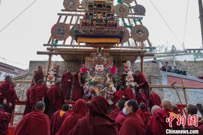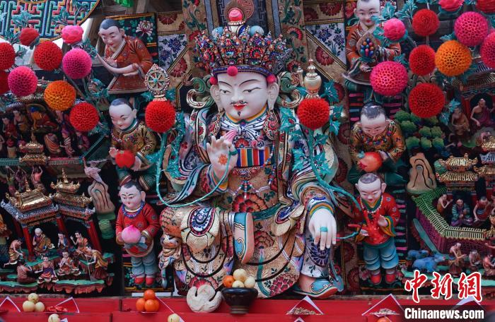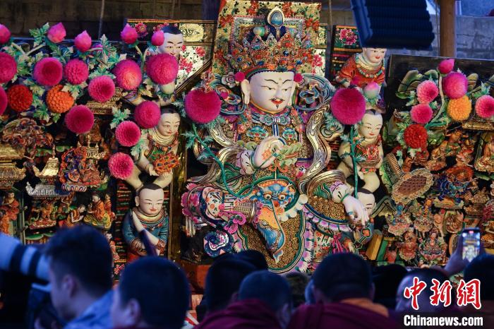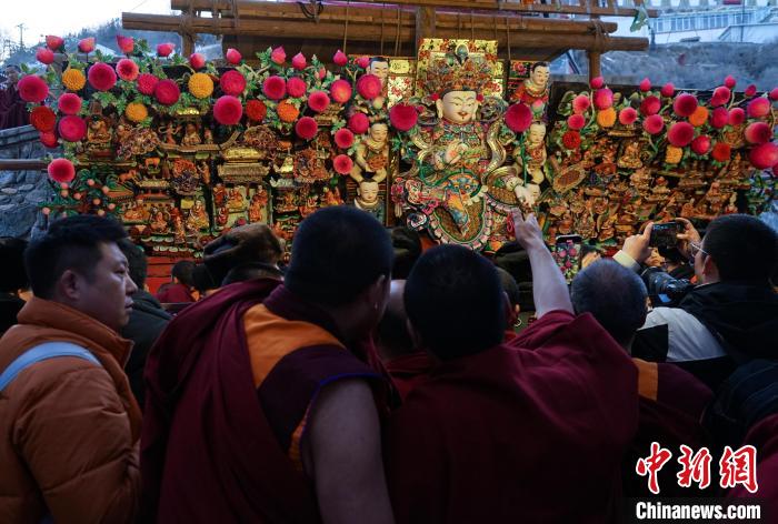 2月24日傍晚,在藏傳佛教格魯派六大寺院之一的青海塔爾寺,代表中國(guó)酥油花制作最高技藝水準(zhǔn)的酥油花展再現(xiàn)“佛前花開”,吸引四方信眾、游客至此朝佛觀瞻。今年塔爾寺上花院主尊是金剛手菩薩,其兩邊為《至尊宗喀巴大師偉績(jī)——八十偈贊頌》的故事,下花院酥油花主尊是人天大怙主未來佛——彌勒尊佛,其兩邊為《十六尊者之一注荼半托迦尊者的故事》。