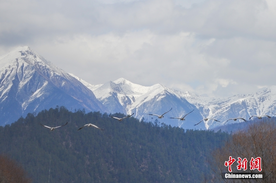 3月30日,在西藏林芝市巴宜區(qū)更章門巴民族鄉(xiāng),黑頸鶴與周邊的村莊、桃花、雪山融為一體,成為春日里的一道靚麗的風景線。圖為黑頸鶴在田間覓食嬉戲。 [詳細]
