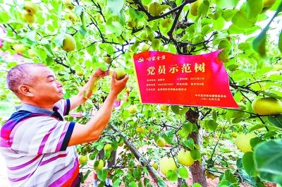 河南省洛陽(yáng)市孟津縣會(huì)盟鎮(zhèn)鐵爐村萬(wàn)畝梨種植基地內(nèi)的“黨員示范樹”。黃政偉攝/光明圖片