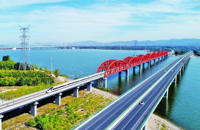 一列動(dòng)車組列車從河北省懷來縣境內(nèi)的京張高鐵跨官廳水庫特大橋上通過。新華社發(fā)