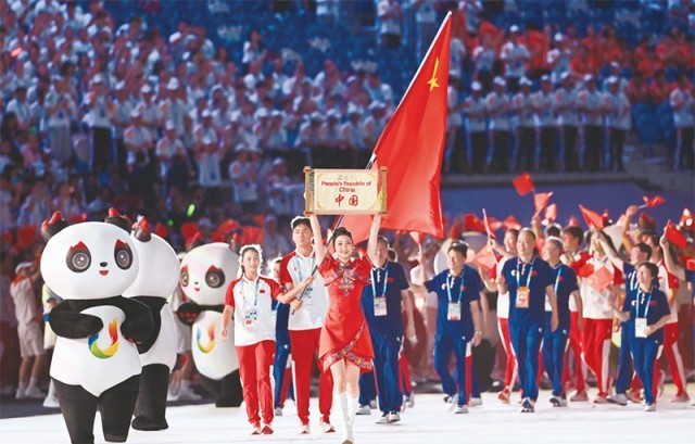 2023年7月28日,第31屆世界大學(xué)生夏季運(yùn)動(dòng)會(huì)開幕式在成都東安湖體育公園主體育場舉行。圖為中國大學(xué)生體育代表團(tuán)在開幕式上入場。 新華社記者 王曦/攝