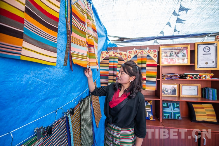 中國西藏網(wǎng)訊 10月13日,西藏自治區(qū)山南市貢嘎縣第二屆七彩邦典文化旅游節(jié)農(nóng)牧產(chǎn)品展銷會(huì)的現(xiàn)場,旦增卓嘎在推銷著自家制作的邦典(藏式圍裙),不大的展位前放著合作社制作的產(chǎn)品宣傳片和國家級(jí)非物質(zhì)文化遺產(chǎn)代表性項(xiàng)目藏族邦典、卡墊織造技藝的代表性傳承人證書。