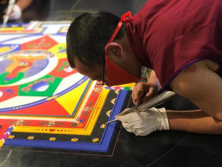 2014年彩砂壇城繪制被列入我國第四批國家級非物質(zhì)文化遺產(chǎn)名錄,它在藏文化中是一種既獨(dú)特又精致的藝術(shù)。在泓文博雅,館藏有兩座巨幅壇城沙畫,均由四川省阿壩藏族羌族自治州阿壩縣賽格寺的僧人們繪制而成。