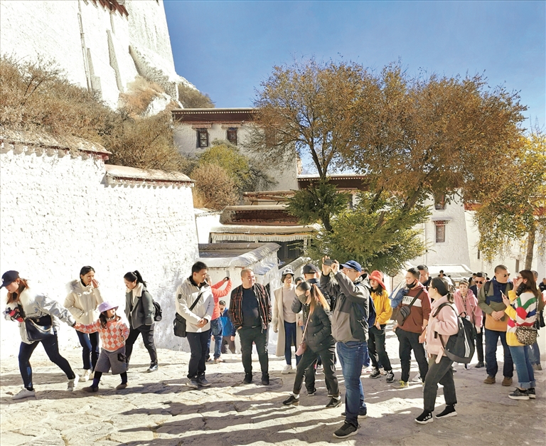 近年來,隨著“冬游西藏·共享地球第三極”活動的舉辦,越來越多的游客選擇在冬季來到美麗的雪域高原,而雄偉的布達(dá)拉宮是他們進(jìn)藏游玩的首選之地,每天排隊(duì)參觀布達(dá)拉宮的人絡(luò)繹不絕。圖為游客在布達(dá)拉宮參觀和拍照留念。記者 梁道燕 攝